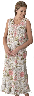 To the left is a breezy, more ornate nightgown with an ivy-floral pattern. Rosy pink and mint green paint the feminine print. Ruffles accent the neckline and sleeves. A more relaxed ripple finishes the gown at the bottom. The ivy-floral print is also available in pjs, which are also sleeveless.
